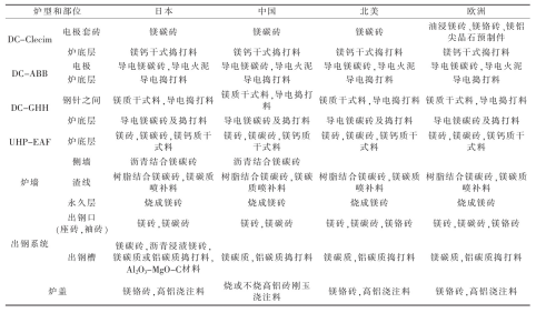 摘 要:由三根電極的普通交流電弧爐發展為超高功率(UHP)及一根電極的直流(DC)電弧爐,爐體結構有一些改變。針對各部位的損毀因素,內襯用的耐火材料也有所發展。例如普通電弧爐的爐頂用高鋁磚、爐墻鎂磚砌筑,而UHP及DC電弧爐采用大面積水冷爐頂、爐墻,爐頂三角區采用剛玉澆注料或預制件,爐墻用鎂碳磚,蝕損嚴重部位采用噴補作業。還介紹了日本等一些國家DC和UHP的各種爐型用耐火材料。煉鋼電弧爐是以電極端部和爐料之間發生的電弧為熱能進行煉鋼的設備。電弧爐以廢鋼為爐料直接煉鋼,與礦石煉鐵后再煉鋼相比,基建投資少,節能60%、節水40%、減少廢氣排放86%、減少廢渣97%[1]。交流電弧爐歷史悠久,交流電是通過三根石墨電極輸入爐內,在電極下端與金屬料之間產生電弧,利用電弧高溫直接加熱爐料,使煉鋼過程得以進行。供電功率越高,爐料熔化速度越快,降低能量消耗越多,因此出現超高功率(UHP)電弧爐。在超高功率的基礎上發展了直流(DC)電弧爐煉鋼。直流電弧爐是以一根石墨電極的端點為陰極,爐底為陽極,石墨電極位于爐膛中心部位。與UHP相比設備結構簡單,建設費用低,熔池中的電流與熱量分布比較均勻,不存在過熱區域,因此耐火材料損耗比較小、節能且噪音小等。目前,煉鋼電弧爐向大型化、控制自動化方向發展。我國的電弧爐主要用來生產合金鋼。煉鋼水平與工業發達國家相比差距較大,如2015年我國電爐鋼占粗鋼總產量的6.1%,2020年有所提高,但也不超過10%,與世界平均水平的30%相比還有較大差距。我國已經引進先進水平的UHP和DC電弧爐,隨著經濟發展,工業化程度提高,必然伴以廢鋼資源數量增加,同時發展鐵礦石直接還原煉鐵技術,代替廢鋼,增加電弧爐煉鋼的爐料,還有核電的發展,使電弧爐煉鋼有了物質保證。電弧爐的內襯是耐火材料構成的,隨著UHP和DC技術的發展,需要新型優質耐火材料與之相配套。有人說[2]:沒有優質爐襯、爐底耐火材料支持長壽爐齡,超高功率電弧爐就無法發揮高效生產的優勢。爐底耐火材料是直流電弧爐得以實現的必要條件,反映了煉鋼與耐火材料技術的互相影響,互為依存,在電弧爐煉鋼系統優化生產中有不可分割的作用。1 電弧爐的結構變化傳統的電弧爐由爐頂(又稱爐蓋)、爐墻、爐坡、爐底和出鋼槽構成,全部用耐火材料構筑,外包鋼制爐殼。爐墻一側設有爐門,另一側為出鋼口,并與出鋼槽相連。而UHP和DC電弧爐采用偏心爐底出鋼,使爐體由傾動式改為固定式,爐底有供氣攪拌設置,爐頂安裝氧-燃料燒嘴,在爐底偏心位置設置出鋼口,代替出鋼槽。由于取消了傾動設備,擴大了水冷面積,緩和了爐襯的損毀,適當降低了出鋼溫度,并縮短了出鋼時間,從而降低生產成本。爐墻采用鑲砌水冷箱式水冷套措施,其內表面噴涂一層耐火涂料,使其掛渣形成保護層,可有效降低耐火材料消耗,但電耗可能增加。國外有的電弧爐功率達1 000 kV·A/t以上,爐墻壽命達2 000爐次以上,水冷爐蓋壽命達4 000爐次,降低耐火材料消耗60%以上。2 耐火材料內襯的損毀因素電弧爐內襯的耐火材料長期處于高溫、熔渣侵蝕和急熱急冷狀態下,工作條件極其惡劣。在煉鋼的熔化期和氧化期,不致于因高溫損壞爐襯,但在還原期的鋼液溫度相當高,又受電弧直接輻射(有時溫度達4 000℃以上),爐襯很容易造成熔融損壞。出完鋼裝料時,爐襯溫度突然下降,裝完料開始送電,溫度又逐漸升高,這種急冷急熱是爐襯剝落的直接原因,主要是爐頂容易剝落。耐火材料內襯損毀的主要因素包括[3]:(1)化學侵蝕。FeO或渣中SiO2與耐火材料中的CaO、MgO之間的化學反應,使爐襯變為熔渣,而導致損毀。(2)耐火材料內襯中的碳成分被含氧成分(如FeO、O2、MgO等)氧化,導致耐火材料脫碳而損毀。(3)沖刷和機械沖擊。鋼水或熔渣流過耐火材料表面,以物理性磨損或沖刷爐襯,而導致內襯損毀;在出鋼口、渣線、電極口或排氣口平臺等沖刷嚴重,廢鋼等爐料吊入往往撞擊爐襯而損毀。(4)水化。在生產過程中,往往會出現爐頂或爐墻漏水或滲水,還有水蒸氣,與堿性耐火材料中的MgO、CaO進行水化反應,使內襯損毀。3 電弧爐用耐火材料根據電弧爐的結構,由于各部位承受的熱負荷大小不同,與熔渣、鋼水接觸作用及機械損壞程度存在差異,不同部位必須采用不同的耐火材料[4]。3.1 爐頂(蓋)我國中小電弧爐普遍采用燒成或不燒高鋁磚,局部用高鋁質或剛玉質不定形耐火材料預制件。大型超高功率電弧爐和直流電弧爐采用水冷技術,除三角區外,爐頂耐火材料不是關鍵。三角區由于強烈熱震及電極熱輻射苛刻,國外普遍采用剛玉質或鋁鉻質搗打料,我國一般用高鋁質或剛玉質搗打料。天津鋼管集團公司150 t超高功率電弧爐,爐頂三角部分(三個電極孔周圍)采用鉻剛玉質澆注料預制件,預先烘烤,現場直接使用,并解決了電極孔定位的難題。還針對氧槍上部損毀較快問題,在該區域采取局部加厚處理,使爐頂各部分損毀速度基本一致,最高壽命達676爐次。3.2 爐墻(壁)分為一般爐墻、渣線區和臨近電弧的熱點部位爐墻。一般爐墻主要用鎂磚、白云石磚砌筑,也有用不燒鎂磚和瀝青結合的鎂質及白云石質搗打料。超高功率和直流電弧爐冶煉特殊鋼的爐壁使用鎂鉻磚和優質鎂磚砌筑。由于渣線和熱點部位是爐墻的薄弱環節,爐墻的壽命主要取決于熱點部位的損壞程度,因此特別重視熱點部位的耐火材料,早期使用